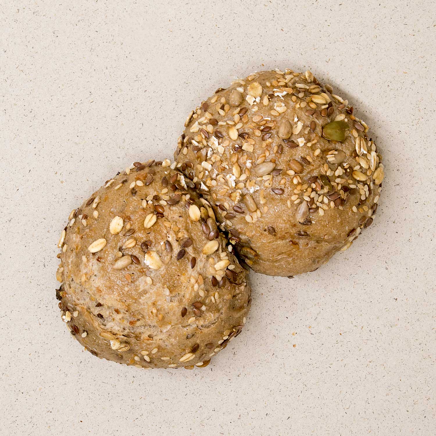 Zwei zusammmengebackene kleine Brötchenlaibe mit ordentlich Kernen und Nüssen. Angebaut, gemahlen und handwerklich verarbeitet im Spessart!